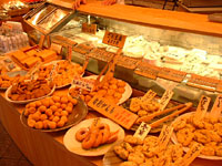 店舗右側のケースにかわいらしく収まっているデザート類は豆乳杏仁。(\150)口当たりもつるりとまろやか。おからで作ったドーナツ(\100)、こちらも豆乳が原料のかわいいきなこボール(6個\200)は早いもの勝ちです。きちんとした材料でつくられているから子供たちにも安心です。